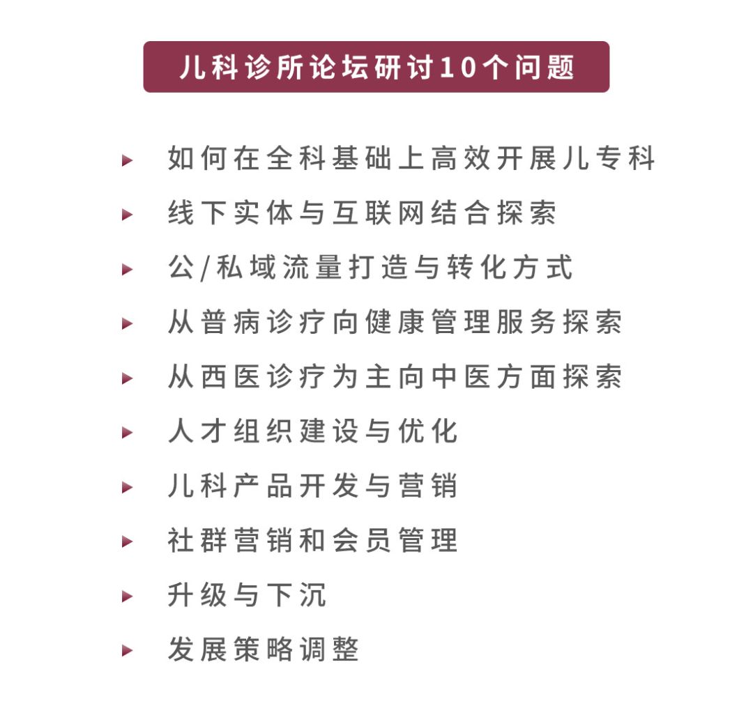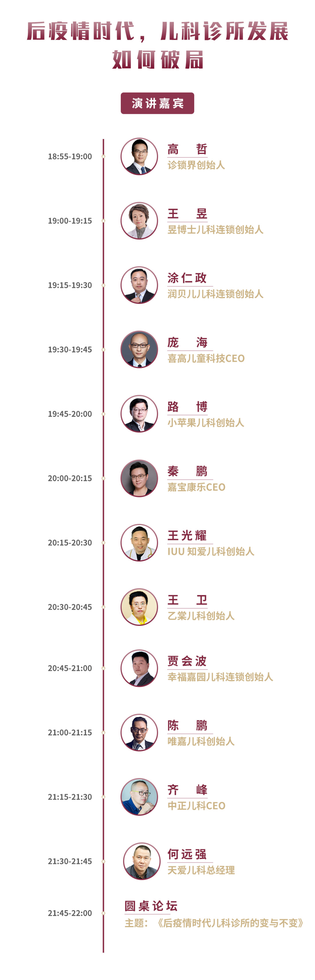 组委会邀请12位儿科诊所行业大咖,以“破局——后疫情时代,做儿科诊所的'变'与'不变'”为话题,围绕10个问题开展分享、研讨、争鸣: