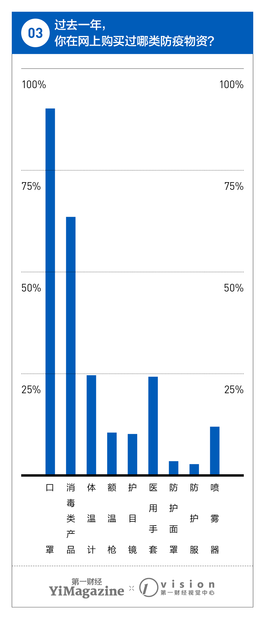 我们的调研也显示,超过90%的消费者在过去一年里购买过口罩,超过60%的消费者购买过消毒类产品。