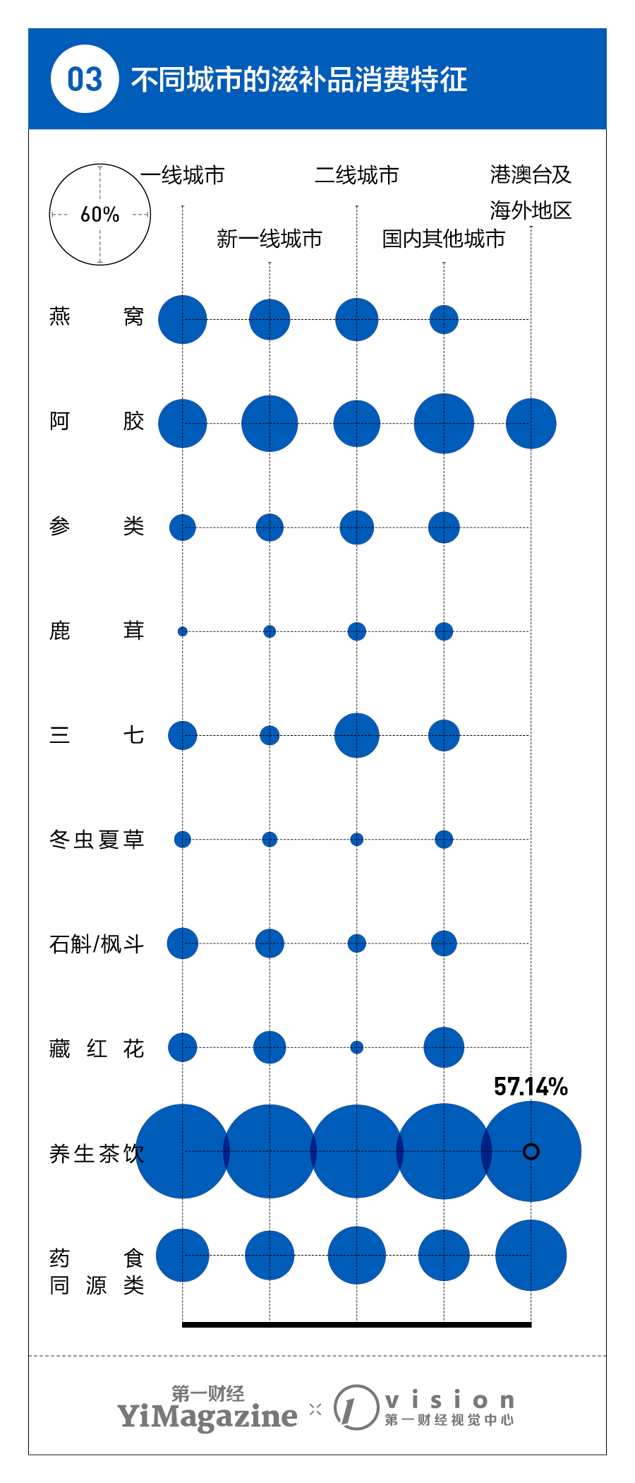 滋补品中,养生茶饮是所有城市中消费占比最大的一类,高线城市对于燕窝、阿胶等较高端滋补品消费占比略高,低线城市则对三七、药食同源类滋补品需求较高。