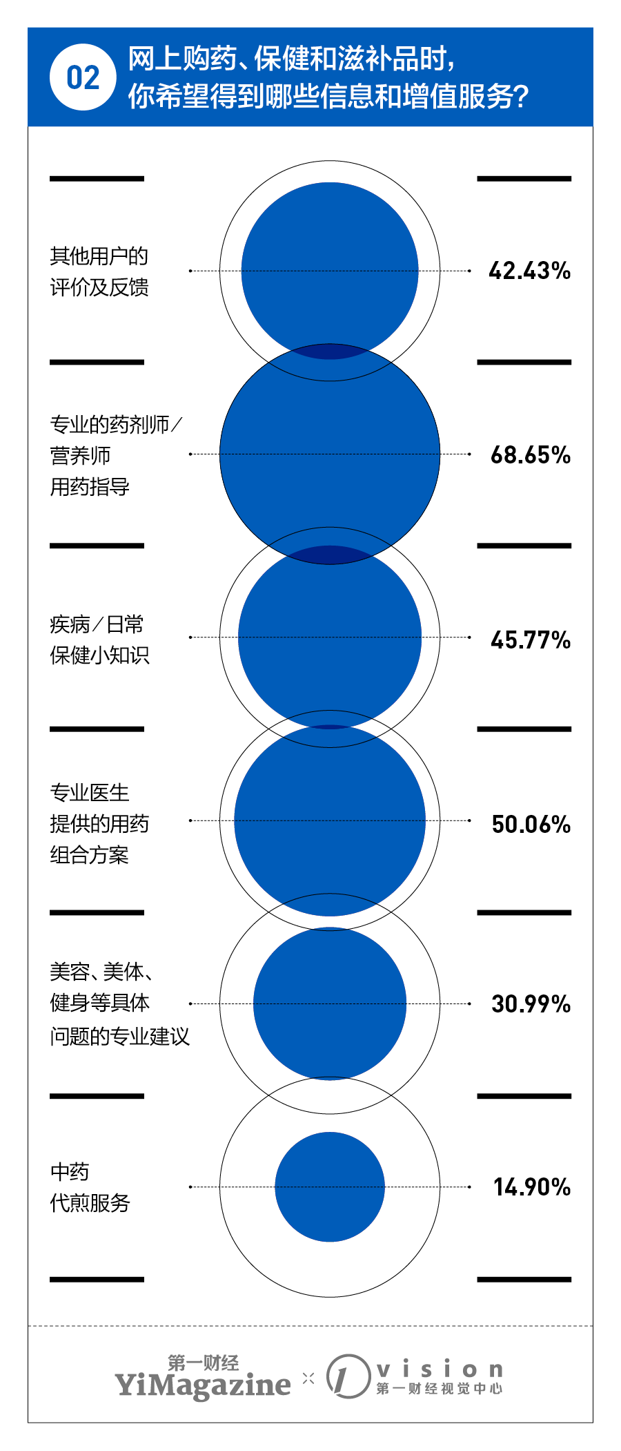 根据调研,近70%的消费者在网上购买药品、保健品以及滋补品时,希望能得到医生、药剂师和营养师的专业指导,超过50%的消费者希望获得专业医生提供的用药组合方案。