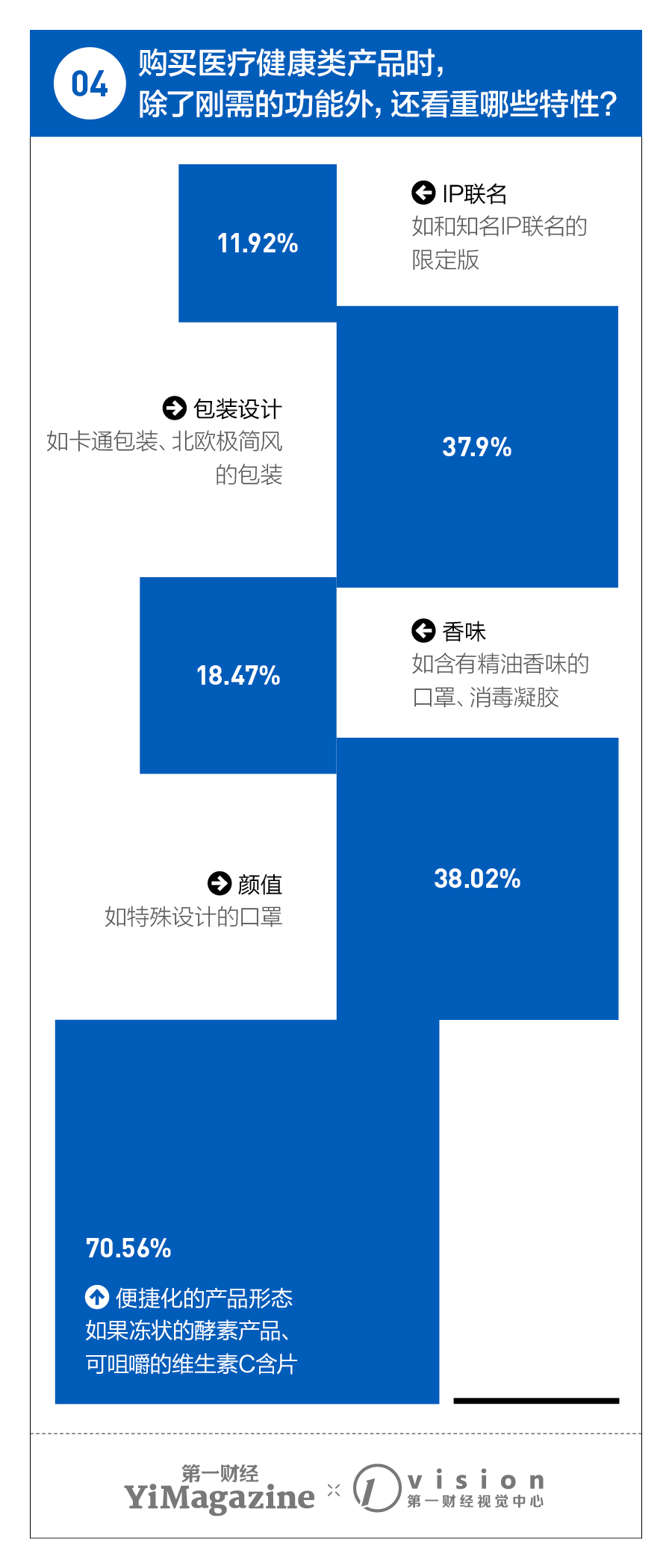 调研中,70%的消费者认为可以有更便捷的产品形态——它们可以是可咀嚼的含片,可以是便携的果冻状产品;有超过1/3的消费者希望能看到产品更美观的包装,比如也可以拥有卡通形象;38%的消费者希望产品有更高的颜值,比如经过特殊设计、更为美观的口罩;更有11%的新潮消费者希望,健康产品也可以向时尚界“取经”,比如时不时和潮牌来个IP联名。