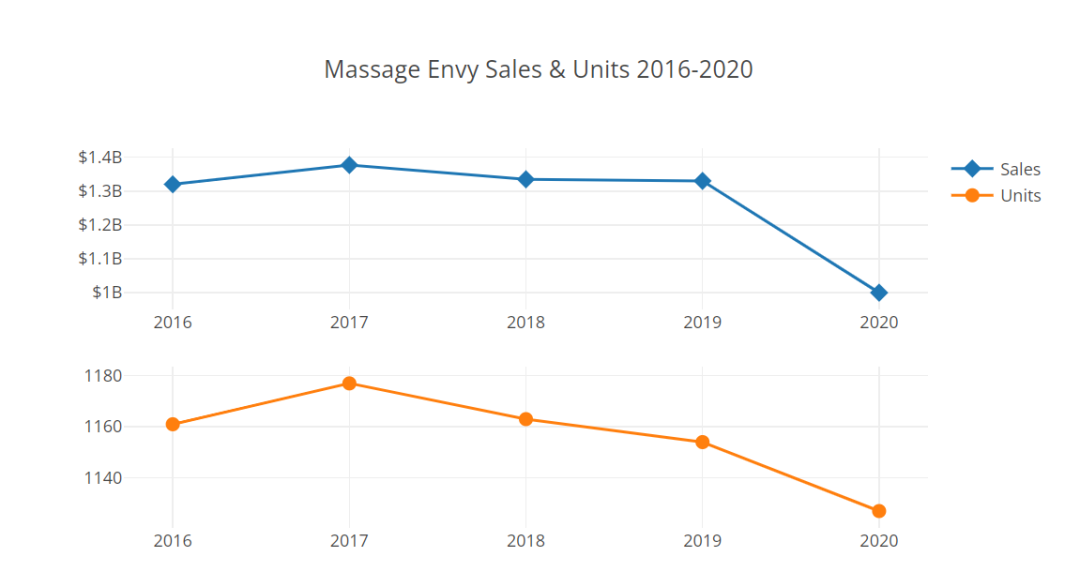 疫情前Massage Envy的业绩逐渐碰到了瓶颈,2020年突如其来的新冠疫情关门停业更是让其跌入历史最低点。但没想到疫情平稳后其业务量恢复得极快甚至翻倍增长,有一半以上的客户是第一次接触治疗性按摩这样的方式。