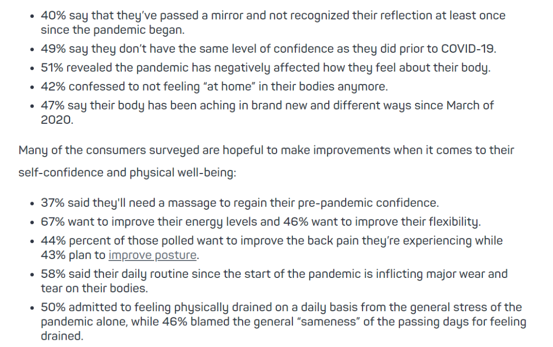 One Poll曾发布过一项关于COVID-19疫情大流行以来年轻一代身体精神状况的调查,在2000名调查对象中,50%的人表示在疫情居家期间每天都感到压力大且疲惫不堪,“千篇一律”的生活是疲惫的最主要原因;47%的人表示在居家办公期间经历过人生第一次慢性疼痛的折磨;67%的人认为自己需要按摩等专业的帮助,改善所经历的疼痛状况,让他们的身体恢复到疫情前的状态,并重获信心。