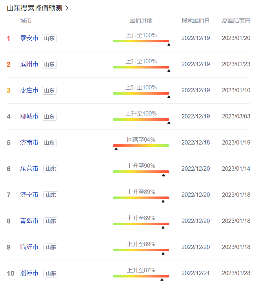 据百度健康预测,山东泰安、滨州、枣庄、聊城等地的疫情搜索将在今日抵达峰值,搜索高峰将于1月20日前后结束。也就是说未来一个月内将迎来一波新冠病毒疫情流行的高峰期,无论是医院门诊,还是基层卫生站、基层诊所的疫情防控压力将剧增。