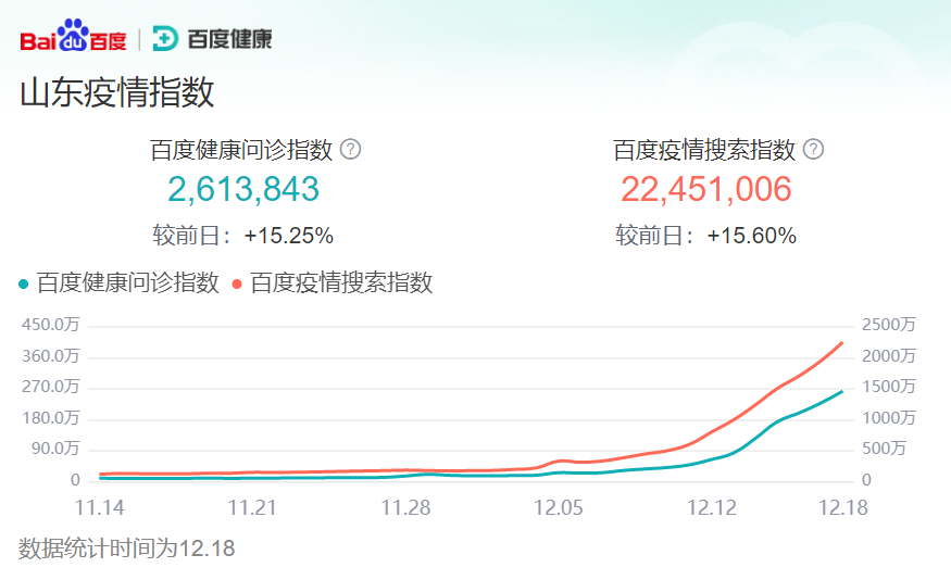 根据百度搜索引擎指数,山东地区的疫情搜索指数为2300万次,相比12月18日上升15%。