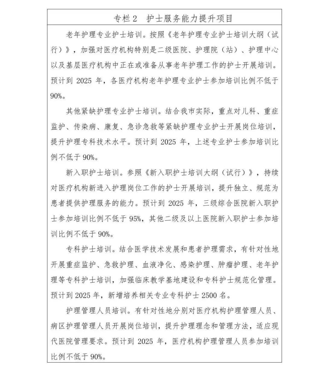 11.加强护理学科建设。以满足重大疾病、重点人群的临床护理需求为导向,加强护理学科建设,以学科建设带动护理人才培养和护理服务能力提升。加大对护理学科建设的投入,推进护理技术创新发展,不断提高护士临床创造性思维能力,鼓励护理人员从临床实际问题出发,以患者感受和健康结局为指引,运用科学的技术与方法切实解决临床护理问题。加大对护理科研的投入,加强院校合作,形成临床、教学、科研、管理相互融合、相互促进的学科发展态势。