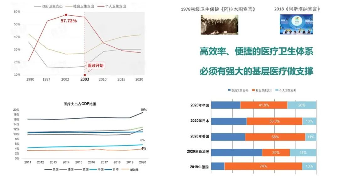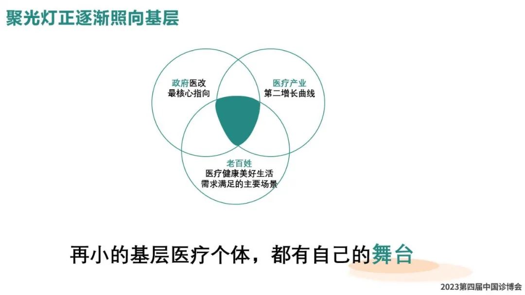 基层正在走向医疗体系的中心,有三个方面,第一国家政策的驱动和医疗效率提高的决心,第二是医疗产业的聚焦,因为集采等等改革举措,传统围绕公立医疗体系的产业正在注重院外市场和非公立医疗体系,给基层医疗带来了许多技术和产品的变革。第三,老百姓对医疗健康美好生活的需求场景,主要是在基层、在社区生活圈,不是在医院,这种需求是非常多的。