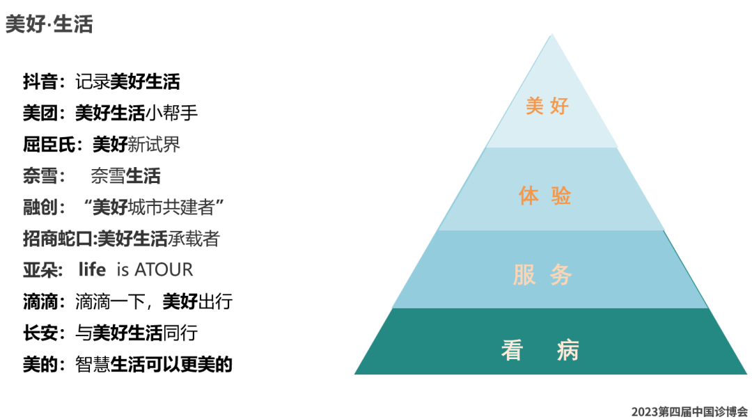 ❿美好生活。当前中国最前沿的这些企业,涵盖了衣食住行,他们的slogan(标语)已经改了,我们的医疗也是生活中极其重要的部分。医疗服务行业主要有几个阶段呢,我总结了大概4个阶段,大部分停留在第一阶段(看病),或者是第二阶段(服务),或者说服务之后,还要给消费者带来一点体验,给员工好的体验, 但未来更多的是带来“美好”。感受美好的东西人们会容易记住你,人生都喜欢美好。
