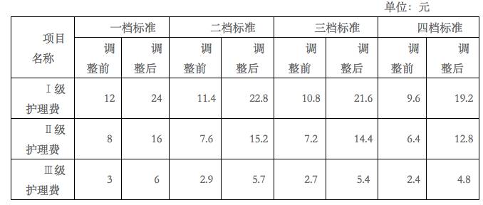 此次调价后,按一档标准收费的医院,I级护理费将从12元涨到24元,II级护理费从8元涨到16元,III级护理费从3元涨到6元。