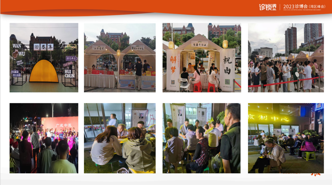这是我操盘的企业广成中医做的夜市,这个活动特别火,打卡的人特别多,通过场外的运作带动场内的运作,它就是一个中医文化的展现。当时老板在做中医夜市的时候,他在想,我们经常做义诊效果也不强,中医夜市效果会好吗?我说那得看你怎么去做。常规的义诊就是放个桌子在旁边,但中医夜市呈现的文化符号是不一样的,呈现的中医内容也是不一样的。果不其然,做了三期中医夜市,期期爆满。大家想一下,如果我们只是在馆里坐着,我们的患者认为那就是一个中医馆,就是一个医疗场所,我没有医疗需求,我可能不会进去。但如果你把所有的东西都呈现在外面,你的中医内容、中医运营放在场地外面,这样给了老百姓更多的展示空间,让老百姓、患者和你的距离更近,他只是过去看一眼,没有需求也会变得有需求。