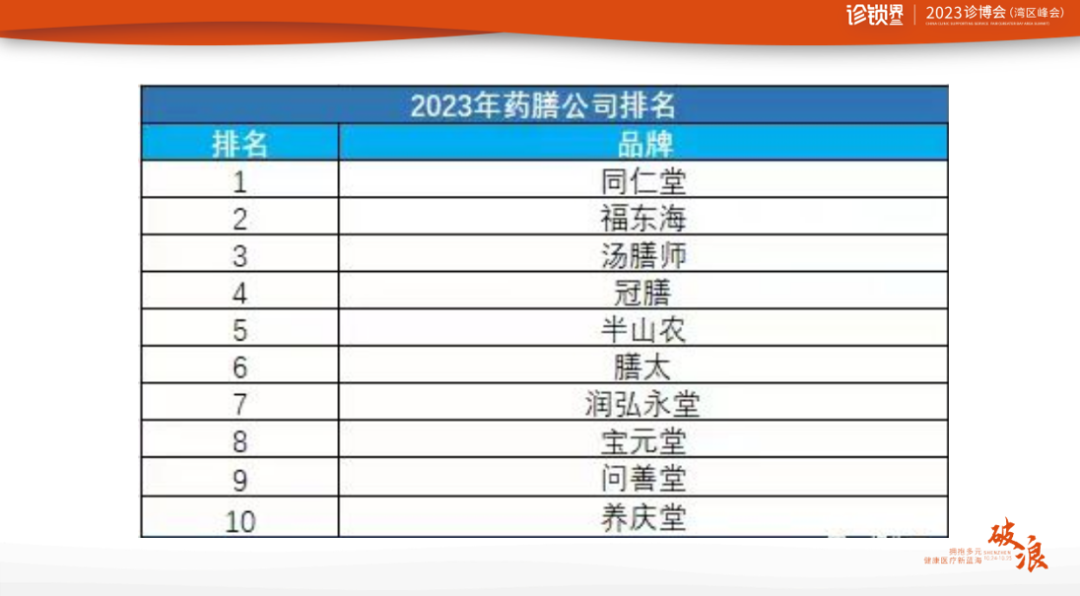 茶饮这个行业特别注重强品宣,每个文案都有相应的脚本和故事性,包括种草博主、达人探店都有脚本,他们玩品宣比传统的中医赛道更会玩。所以它的广告语琅琅上口,投流大范围覆盖,而且还有联名的噱头。我们中医讲的是效果,很难注重颜值和包装。大家可以去屈臣氏,你不到里面,在门口就知道是屈臣氏。你走到哪家连锁医馆是你还没有看招牌就知道是哪家连锁医馆的吗?没有。在奶茶赛道,它的复购率特别高,非常注重私域流量的转化,但我们中医做私域转化的时候特别难,基本是没有能够把私域完全沉淀做转化的,但奶茶就可以。这是2023年药膳公司的排名(图示)。药膳行业的市场规模是1699亿,在这个行业里,增长较好,总体保持较高的增速。据不完全统计,涉及药膳的企业是7.86万家,但它和奶茶的上万家相比还是有差距的。主要分布在药膳、餐饮、凉茶、药酒,还是有点混合,并不单纯是单一的药膳赛道。单一的药膳赛道,它的规模也没有那么大。