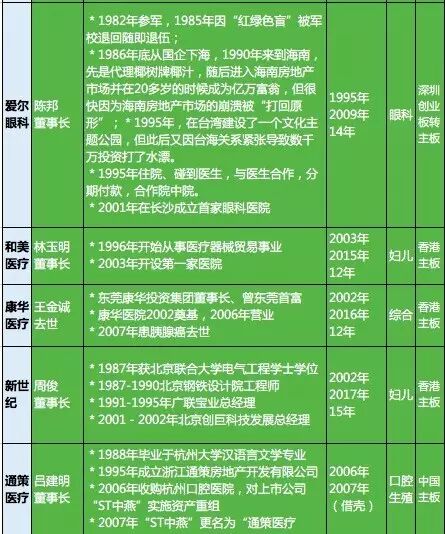 在统计的18家上市公司内,有10家医生创办,即56%是医生创办,是从一个诊所或小医院一点一点长大的,上市后,医生基本都还是控股股东。