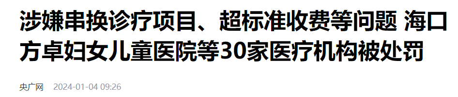 其中,海口方卓妇女儿童医院有限公司涉嫌重复收费、串换诊疗项目、多计费用,违规金额共计75898.92元。↕上下滑动查看完整通报名单,及具体违规事项:海口方卓综合医院有限公司涉嫌重复收费、串换诊疗项目、多计费用,违规金额共计48579元。