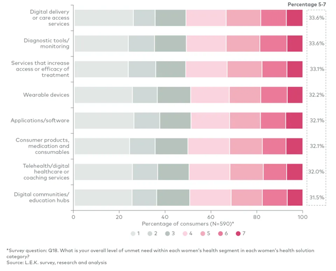 总体而言,约有三分之一到近半数的女性健康消费者表示,其在特定临床领域或特定解决方案类型方面的需求极未得到满足。