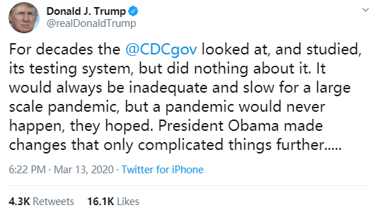 特朗普发推特怒斥CDC对大型流行病反应能力不足
