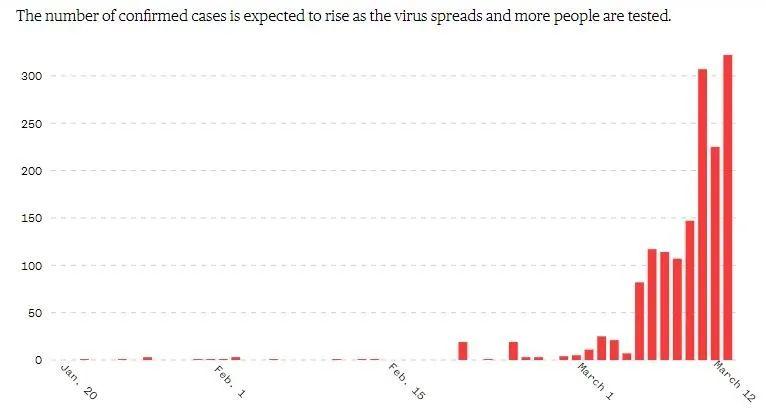 (美国自1.20~3.12新增确诊患者人数,来源:NBC)