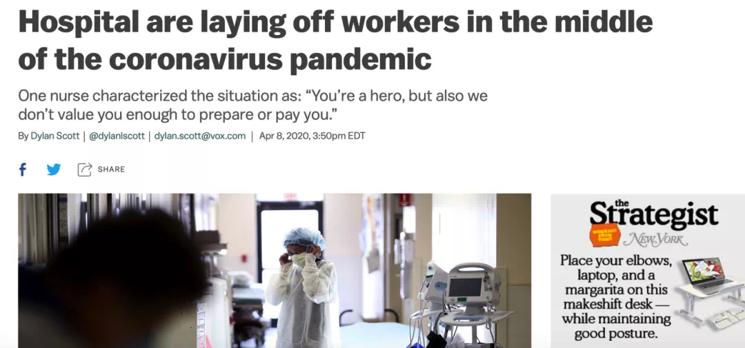 为防止疫情扩散,暂停手术及延迟非必要、非紧急治疗是明智的选择,但这也砍掉了大部分医院的主要收入来源。为减少运营成本,医院被迫临时裁员节省开支。