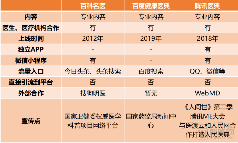 流量入口:在字节跳动完成收购后,三款产品的流量入口方式基本一致,都是从自家流量平台导入。百科名医网从今日头条和头条搜索中获取流量;百度健康医典主要通过百度搜索获取流量;腾讯医典则从微信或QQ搜索入口获取流量。而且三家都不直接将流量导入医典平台上,流量仍然留存在原平台。