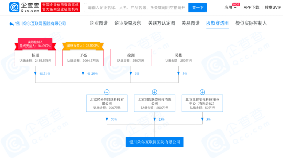 5月26日获讯,银川朵尔互联网医院有限公司发生多项工商变更,其股东新增北京轻松筹网络科技有限公司和北京奥佳安视科技服务中心(有限合伙),二者分别持股70%和5%;原全资大股东北京网医联盟科技有限公司持股比例下降为25%。轻松筹为大股东。(企查查)