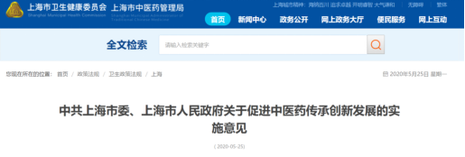5月25日,上海市委、市政府发布了《关于促进中医药传承创新发展的实施意见》