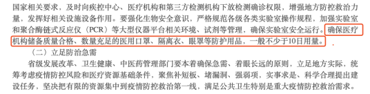 5月21日,国家卫健委联合3部门发布《公共卫生防控救治能力建设方案》(以下简称《方案》),各地将参照《传染病医院建设标准》,确保医疗机构储备质量合格,有数量充足的医用口罩、隔离衣、眼罩等防护用品,一般不少于10日用量;并加强基础设施建设和设备改造升级,配套建设医疗废弃物和污水处置设施,强化相关物资储备。各地根据实际情况,在每个城市选择1-2所现有医疗机构进行改扩建。(卫健委)