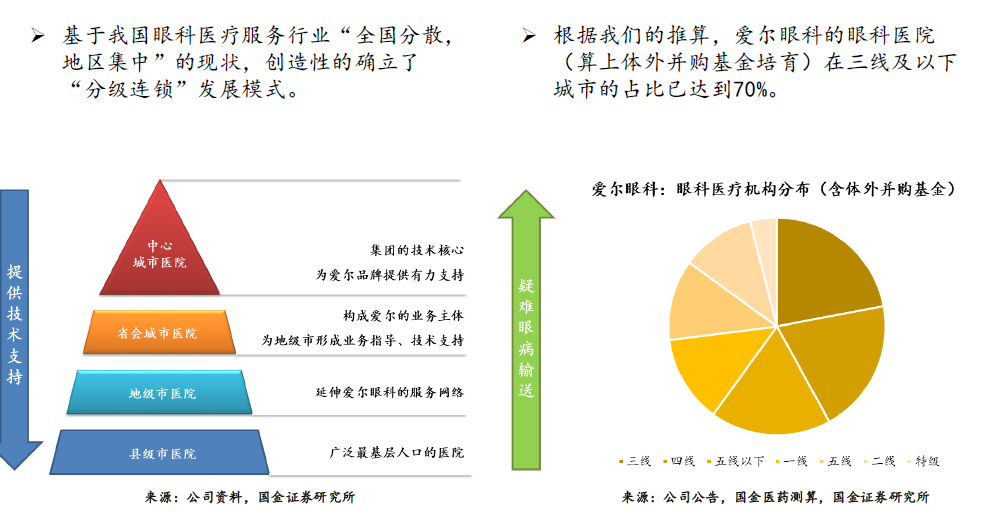 ❶分级连锁生态。爱尔眼科将加强在一线城市医院的科研、创新力量,同时将继续落实分级诊疗。我们期望打造 1 家世界级水平的眼科医院,打造 8 家国家级和区域级的龙头医学中心,提高省会城市医院的水平,提高地级,特别是县级医疗水平。